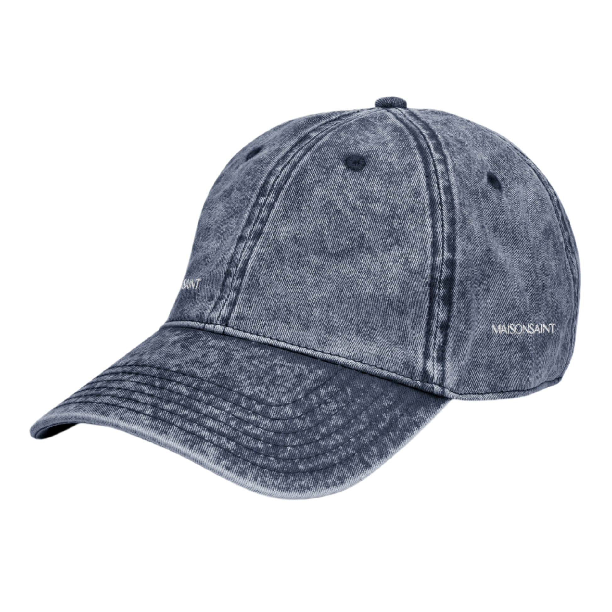 The Maison Cap in washed denim — stitched with presence, softened with wear. Embroidered restraint on a timeless frame.
